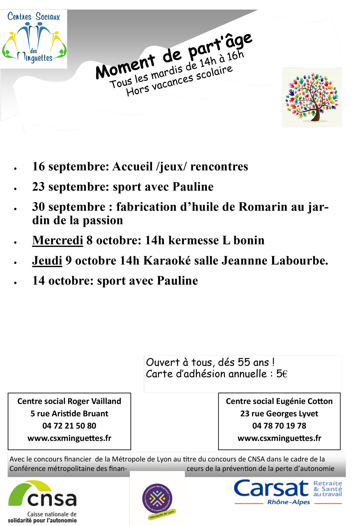 Moment de Part’âge": un espace d’échange et de convivialité pour les plus de 55 ans Ce groupe d’habitants organise régulièrement des activités variées (jeux, ateliers, débats, sorties…) afin de favoriser le lien social et le bien-être des participants.