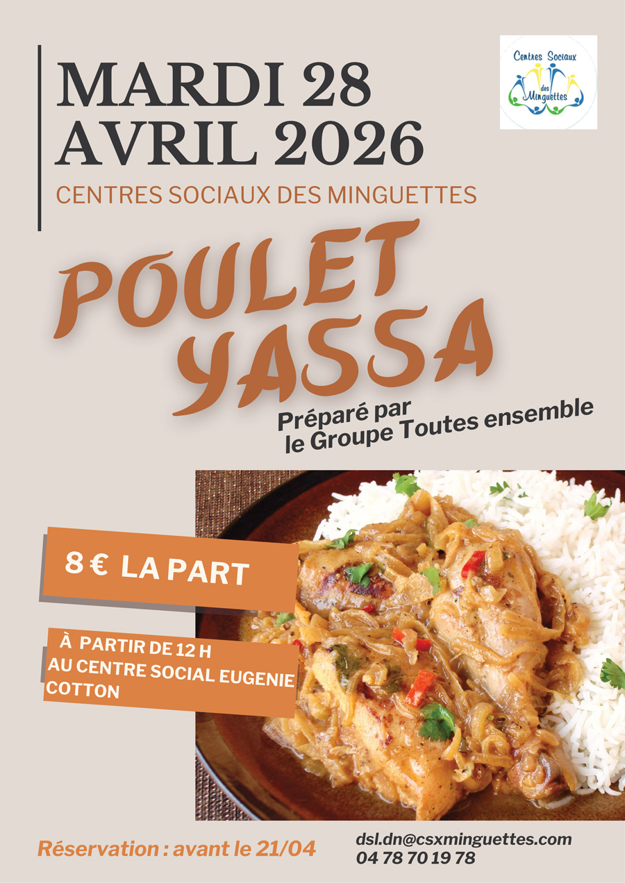 Le Centre Social Eugénie Cotton vous invite à partager un délicieux Poulet Yassa, préparé avec soin par le groupe Toutes ensemble. Un moment convivial et gourmand à ne pas manquer.